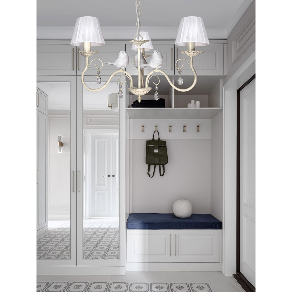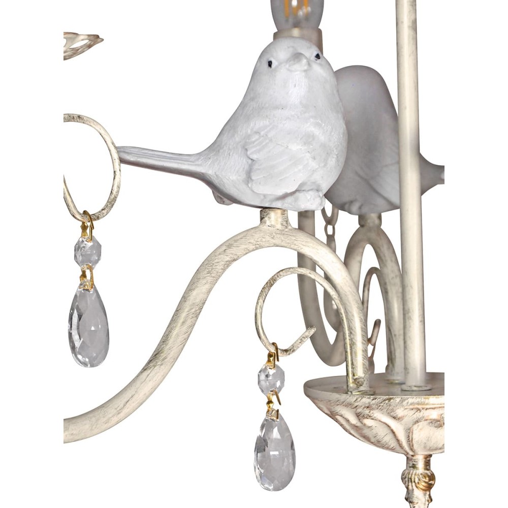 Люстра выполнена в бежевом цвете с патиной золота, что придаёт ей утончённый и роскошный вид. Абажуры, которые одеваются на лампочки, обеспечивают мягкое и приятное освещение, создавая атмосферу уюта. Птички и хрустальные подвески добавляют изящества и легкости в общий дизайн. Стиль «классический» и «прованс» делают эту люстру универсальной, позволяя ей гармонично вписаться в различные интерьеры — от современных до традиционных. Люстра с птичками в стиле прованс станет идеальным решением для тех, кто ценит уют и красоту в каждом элементе декора.