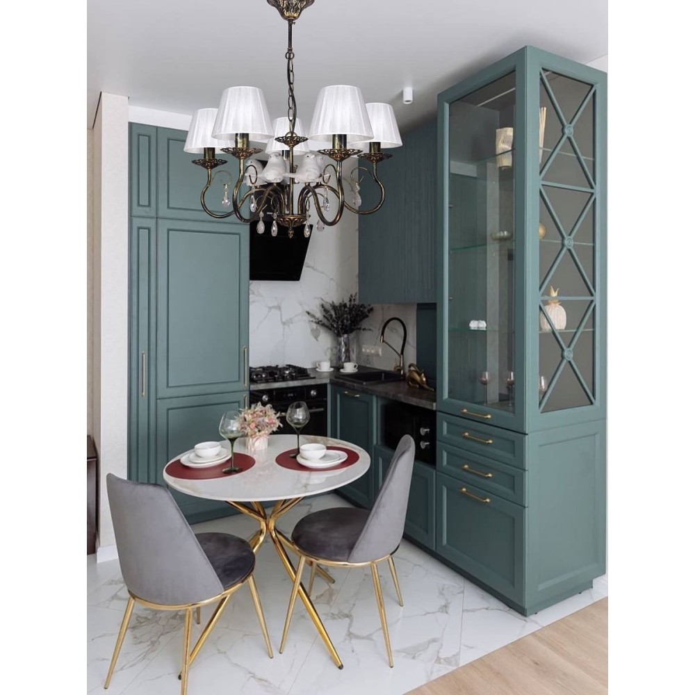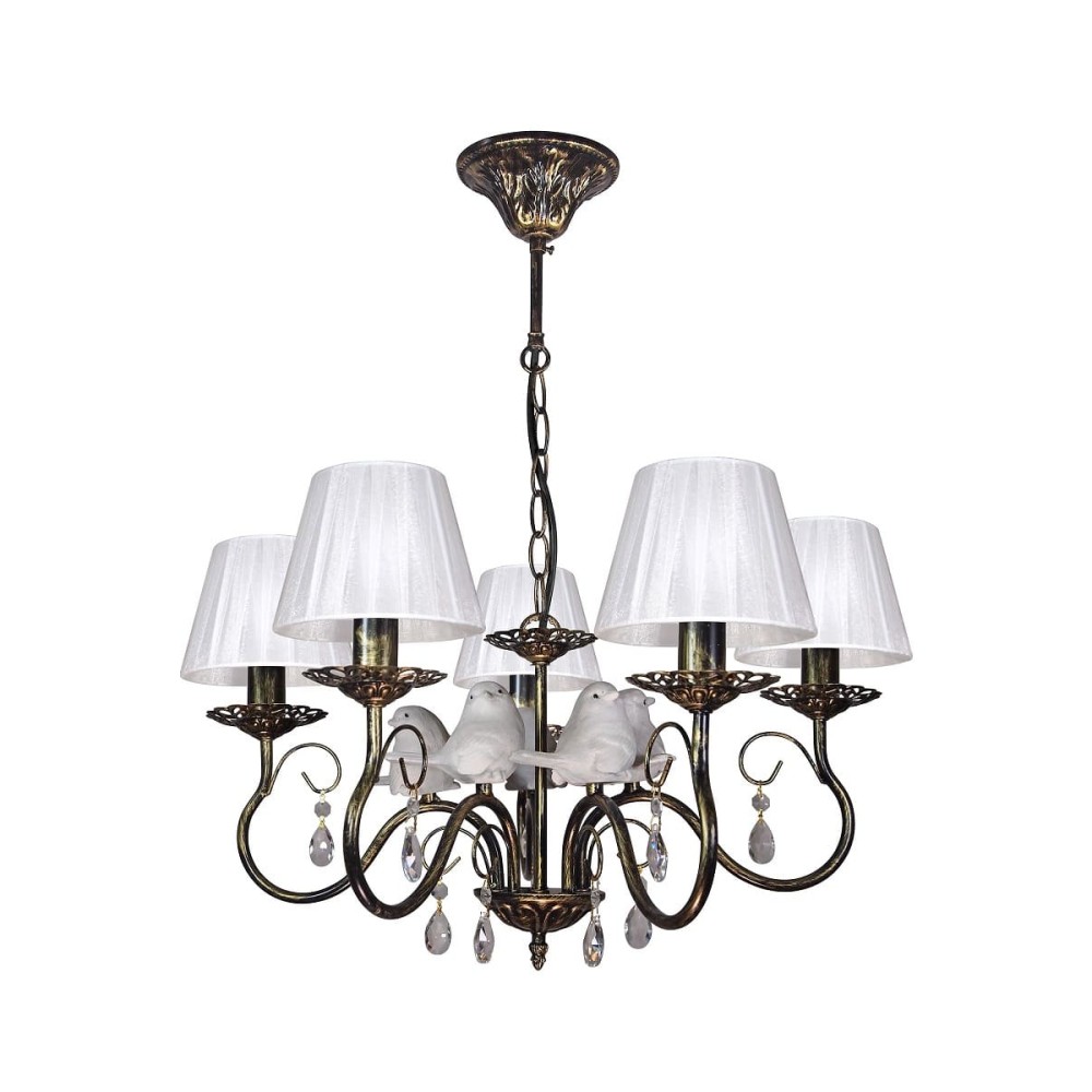 Люстра с птичками, абажурами и хрусталем S1295-5 от Петрасвет Описание товара Люстра с птичками и хрусталем S1295-5 — это великолепное подвесное освещение, которое станет изысканным акцентом в вашем интерьере. Производимая российской компанией Петрасвет, эта модель сочетает в себе элегантный дизайн и высокое качество, что делает её идеальным выбором для создания уютной атмосферы в вашем доме. Основные характеристики Модель: S1295-5Количество ламп: 5Количество птичек: 5Количество абажуров: 5Количество хрустальных подвесок: 10Цвет: бежевый с патиной золотаВысота: 62 смДиаметр: 56 смВес: 2 кгТип ламп: E14 (лампы не входят в комплект)Количество включений: 1 или 2Цепь: возможность укорочения до 1 звена на 17 смГарантия: 7 лет Дизайн и стиль Люстра S1295-5 выполнена в нежных бежевых тонах, что позволяет ей гармонично вписаться в различные стили интерьера: от классического до современного. Птички на абажурах и хрустальные подвески добавляют изделию утонченности и шарма, создавая атмосферу легкости и уюта. Преимущества Качество и надежность: Изготовлена из высококачественных материалов, что гарантирует долговечность и надежность в использовании.Эстетика: Элегантный дизайн делает ее не только источником света, но и стильным элементом декора.Гарантия: Долгосрочная гарантия на 7 лет подтверждает высокое качество продукции. Заключение Люстра S1295-5 от компании Петрасвет — это не просто источник света, а настоящий элемент искусства, который придаст вашему интерьеру уникальность и стиль. Благодаря своему качеству и дизайну, она станет прекрасным дополнением любого помещения.