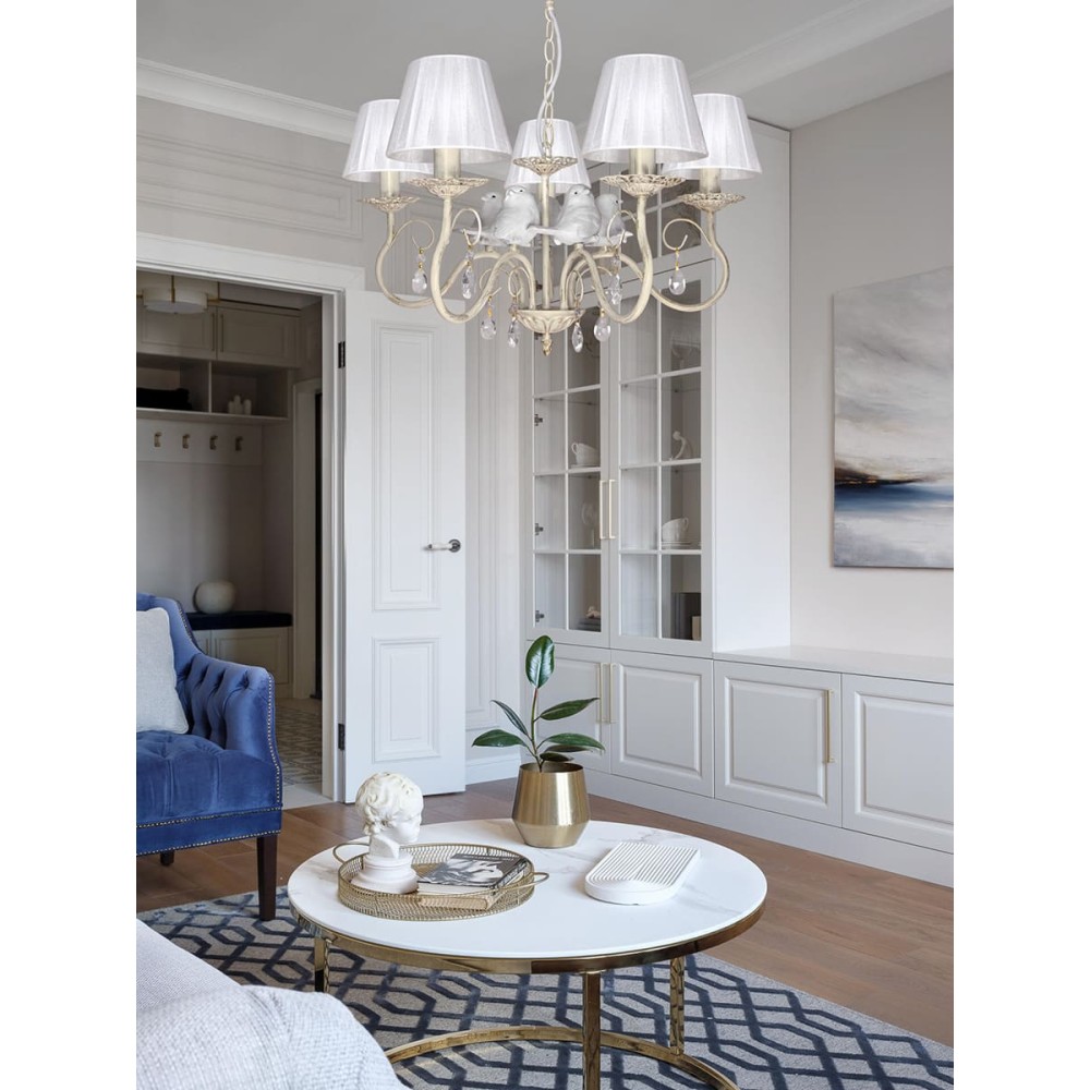 Люстра выполнена в бежевом цвете с патиной золота, что придаёт ей утончённый и роскошный вид. Абажуры, которые одеваются на лампочки, обеспечивают мягкое и приятное освещение, создавая атмосферу уюта. Птички и хрустальные подвески добавляют изящества и легкости в общий дизайн. Стиль «классический» и «прованс» делают эту люстру универсальной, позволяя ей гармонично вписаться в различные интерьеры — от современных до традиционных.