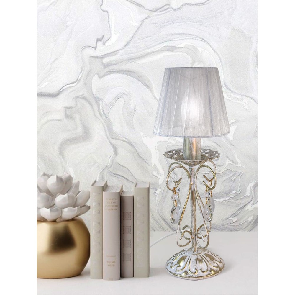 Настольная лампа с хрустальными подвесками классическая Е14 российского производства ПЕТРАСВЕТ S5084-1, 1хЕ14 макс, 60Вт с хрустальными подвесками, стиль - классический, арматура - металл, цвет светильника- белый с патиной золота, размеры светильника (LxWxH) - 14x14x27 без лампочки, вес - 0,5 кг,